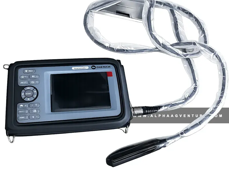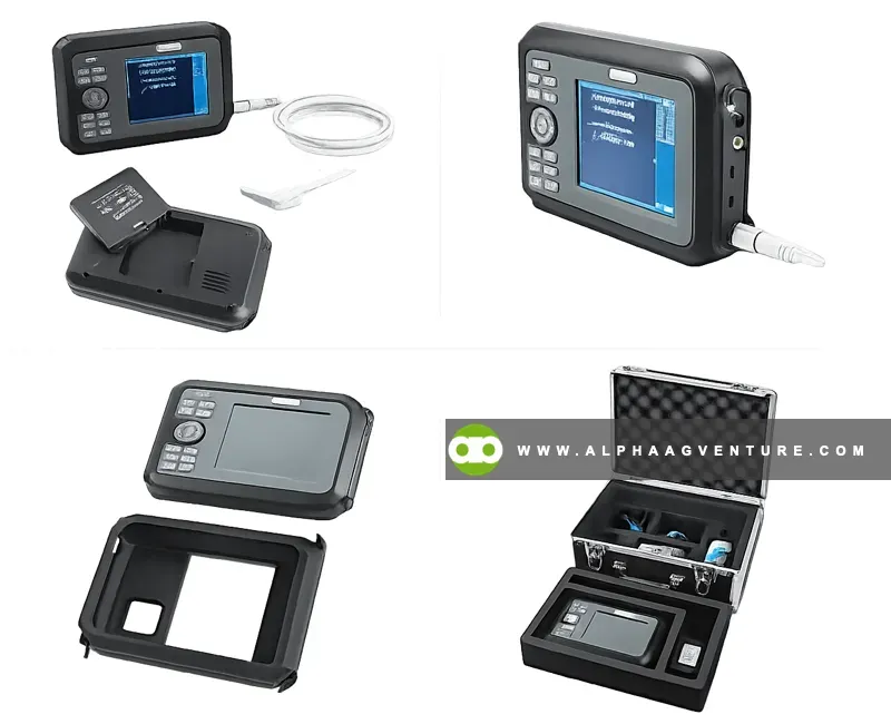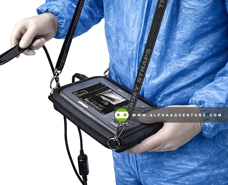 The scanner weighs only 700 grams and works even in muddy or dusty conditions. It is splash-proof, runs over 2.5 hours on battery, and can be used handheld, worn with straps, or placed on a table. It is made for real farm use, not just clean clinics.